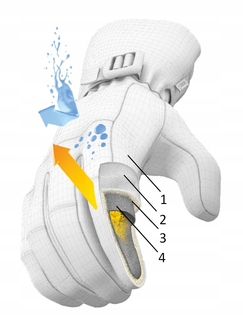 - Izolacja – znajduje się bliżej dłoni i ma za zadanie izolować przed chłodem i ogrzewać wnętrze rękawicy, zapewniając przy tym szybką wymianę ciepła, w celu uniemożliwienia przepocenia się dłoni.
